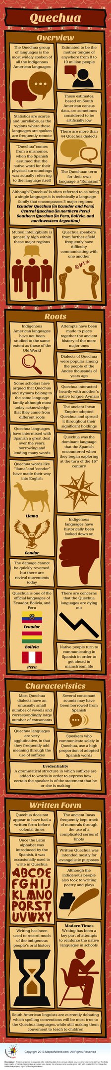 Кечуа – крупнейший индейский язык по числу носителей, распространённый, главным образом, в Перу, Боливии и Эквадоре; в прошлом это был государственный язык империи инков, завоёванной испанцами в XVI веке.